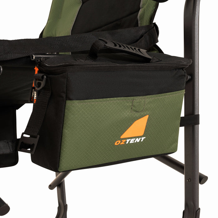 The chair also features our patent pending sail track system that seamlessly attaches to the OZTENT Chair Side Cooler that includes a comfortable clip-on shoulder strap, for keeping drinks cool and easy to transport.