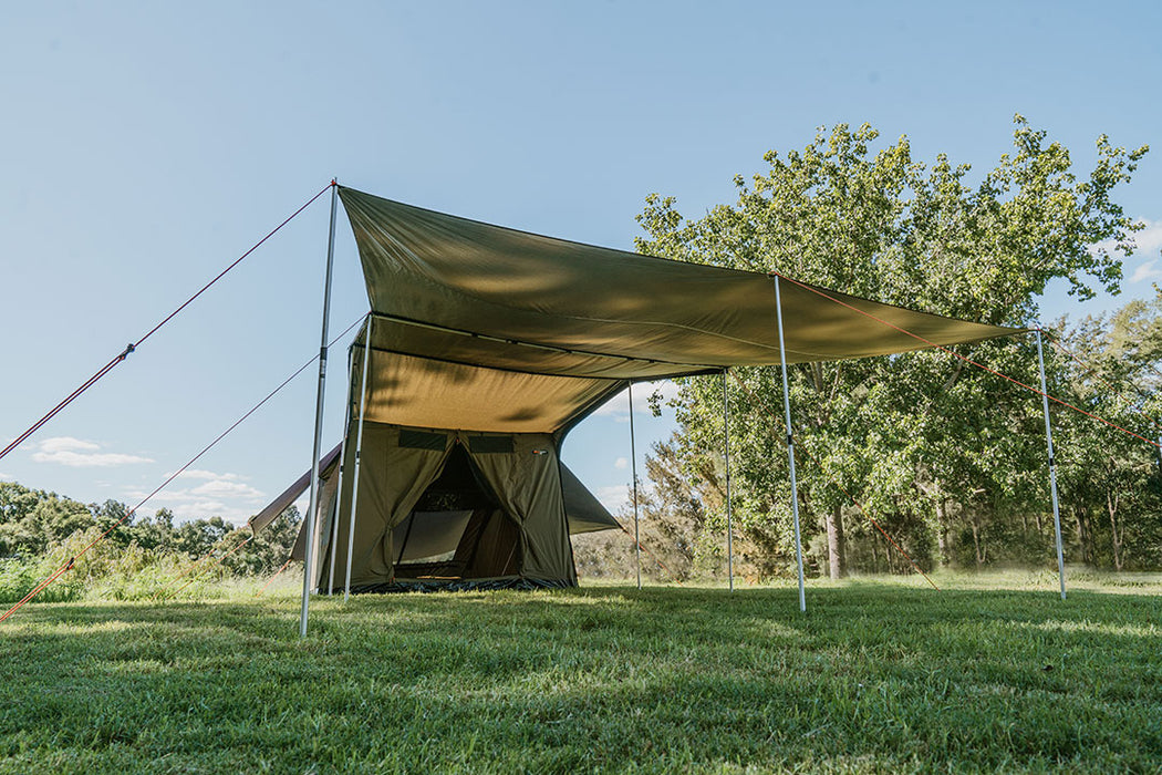 Zip-In Tarp Extension (included) tapers out to give the front a massive 5m width