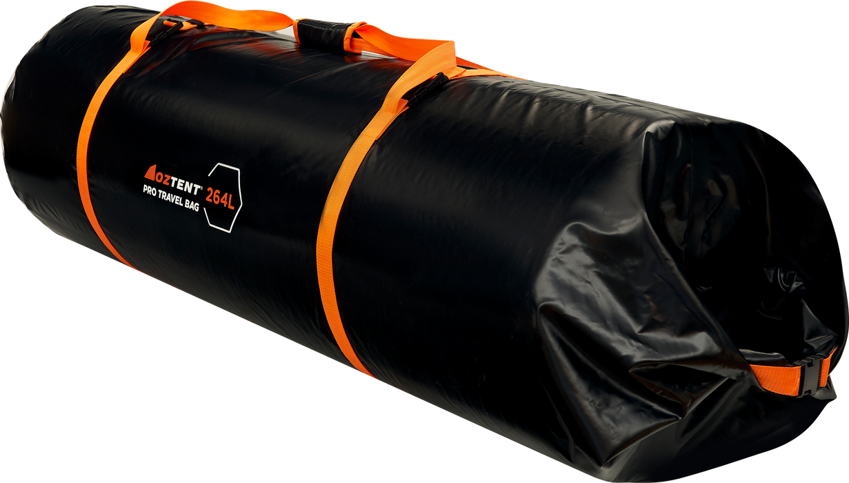 The OZTENT 264L Pro Travel Bag is designed to be an easy to use, extremely tough, reliable, and waterproof means of protecting 264L of kit from the elements. The Pro Travel Bag uses a simple roll and clip technology to keep everything secure and safe. The OZTENT 264L Pro Travel Bag has also been designed to perfectly fit the OZTENT DS-2 Pitch Black Double Dome Swag, ensuring it rolls out clean and dry to use no matter what the conditions.
