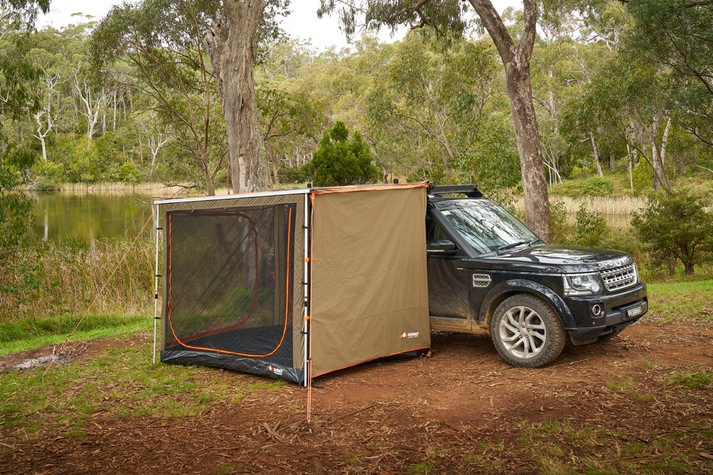The Foxwing 2.5 Awning Screen House, with its mesh walls, large doors and integrated tub floor, is the perfect lunch or lounge room straight off the side of your vehicle.