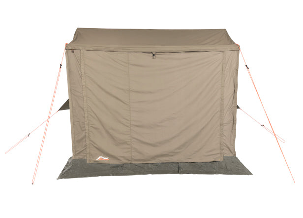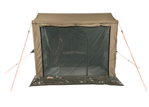The OZTENT RV Plus Front Panel allows you to completely close in your awning when used in conjunction with the optional Peaked Side Panels. It simply zips to the front of the awning. This panel has a large screened area with a zippered door made from No-See-Um mesh. It also has a drop-down zippered canvas panel for when it rains. This drop-down panel can also be used as an extra awning with the use of extra poles (poles not included).